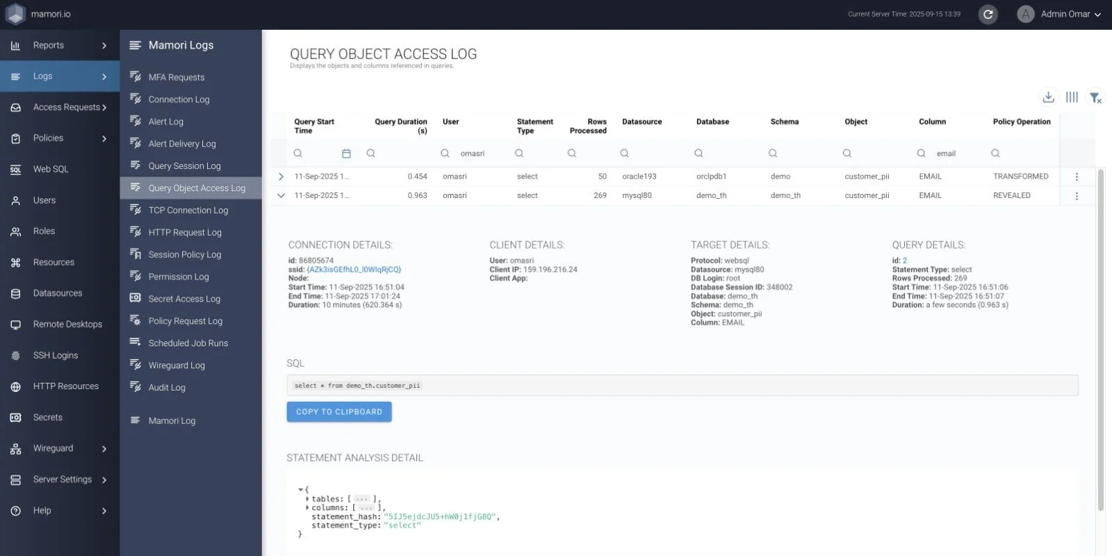 Mamori Query Object Access Log (above) not only connection, client, and target details, but also the query details.