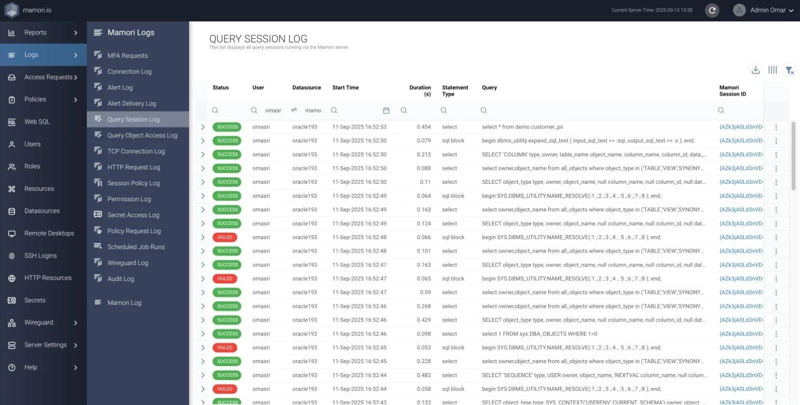 Mamori Query Session Log (above) shows data operations executed and automatically blocks any unauthorized access.